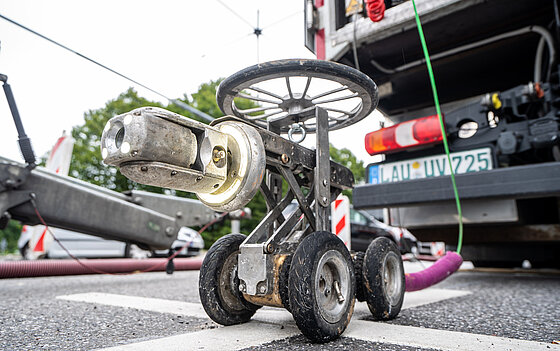 In regelmäßigen Abständen reinigen Grünert und seine Kolleginnen und Kollegen unsere großen Stammsiele. So sorgen sie dafür, dass die Abwasser-Entsorgung reibungslos funktioniert. In den Stammsielen sind die Fachleute unter anderem mit dem Spülwagen unterwegs, der wie ein Hochdruckreiniger funktioniert: Mit einem Holzschild wird das fließende Abwasser gestaut. Dadurch entsteht Druck, der sich in einem Spalt zwischen Kanalwand und dem Schild des Spülwagens entlädt. So werden die Ablagerungen entfernt.