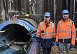 Bildunterschrift: HAMBURG WASSER-Geschäftsführer Dr. Michael Beckereit (l.) und Gesamtprojektleiter Constantin Heffner, ebenfalls HAMBURG WASSER, in der Startbaugrube vor dem neu gebauten Siel. (Quelle: HAMBURG WASSER/Jörg Böthling)