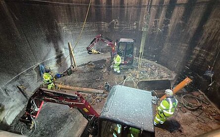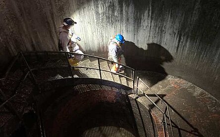 Um in den Schächten arbeiten zu können, müssen wir das Abwasser innerhalb der Transportleitung umlenken. Dafür bauen wir in den jeweiligen Abschnitten eine kleine Leitung in das rund 1,80 Meter hohe Transportsiel ein. So kann das Abwasser während der Bauarbeiten weiterhin abfließen. An wenigen Stellen kann es daher zeitweise zu unangenehmen Gerüchen aus der Kanalisation kommen.